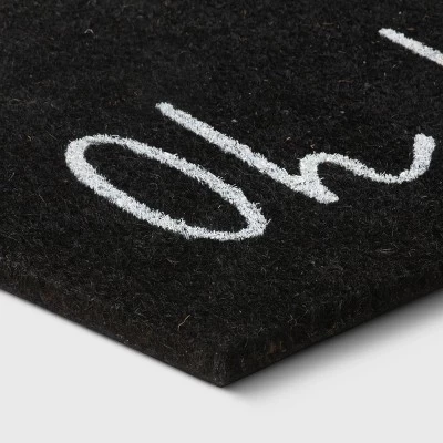 Give your family and friends a warm welcome with this "Oh, Hello" Rectangular Doormat from Threshold™. Made from natural material, this rectangular doormat helps keep your space clean by scraping away dirt and mud right at your doorstep, while the PVC backing keeps it from slipping and sliding. Featuring the phrase “Oh, Hello” in white letters that pop against a black background, this rectangular doormat looks great anywhere from your entryway to your patio, creating a warm and friendly vibe in your space.
