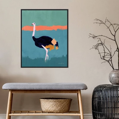 ART DESCRIPTION: A lone ostrich gazes out, still and poised as if waiting for something in this bold and colorful piece. Shades of black and peach with accents of golden yellow create the image of this majestic bird against an abstract background of blue, turquoise, and coral. This Amanti Art canvas art print was created by Pamela Munger and printed by Amanti Art in Madison WI. The canvas is stretched by hand and finished with a float frame. Individually made using traditional custom framing techniques, it has the quality you would expect from your local frame shop. Because of our attention to detail and focus on artistry, architects, interior designers, and homeowners alike choose this framed canvas artwork to create beautiful living spaces.