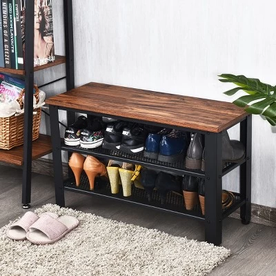 Are you worried about wasting time looking for shoes to wear today in a jumble of shoes? This is our classic and retro 3-tier shoe rack which adds functionality to porch or hallway in your home. Its simple but great design and great storage capabilities are just good to you. Three layers’ open storage design provides spacious space to store plenty of shoes and keeps your living space neat and tidy. This shoe stand is durable and stable because of the premium desktop and sturdy metal frame. The shoe rack can be used as a shoe bench as well because it has high bearing capacity. You can just sit on it to wear your favorite shoes. This coffee table will create an unique and industrial atmosphere to your home!