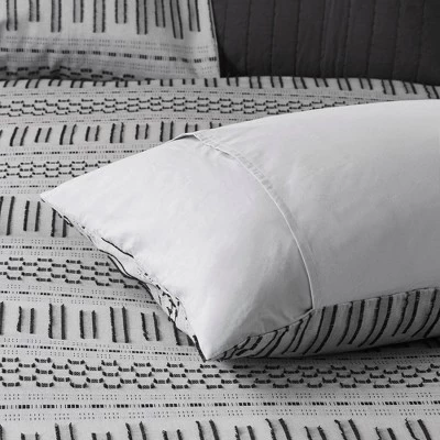 Give your bedroom a comfortable farmhouse look with Rhea Cotton Jacquard Duvet Cover Mini Set. The ivory cotton duvet cover features horizontal stripes, in charcoal hues, with eyelash-looking woven details that add a charming accent to the top of the bed. Matching shams mimic the design seen on top of the bed completing the cotton jacquard bedding set. Made from 100% cotton, this jacquard duvet cover set is machine washable for easy care and provides a causal allure for your bedroom décor. A button closure allow you to place a comforter insert within the duvet cover and four inside ties on the corners help prevent it from shifting (Insert is NOT included). This bedding set is also OEKO-TEX certified, meaning it does not contain any harmful substances or chemicals, ensuring quality comfort and wellness. Items in the set may come in a rolled or compressed packaging, which will need to be fluffed up or steam ironed before use to remove wrinkles.