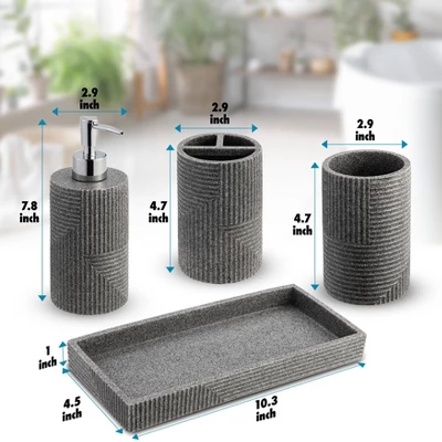 | Includes | Soap/Lotion Dispenser, Bathroom Tumbler, Bath Tray, Toothbrush Holder |