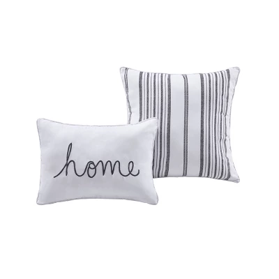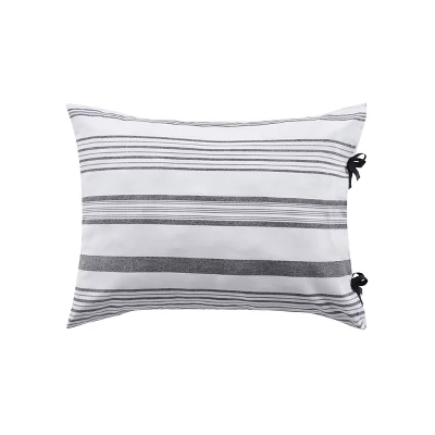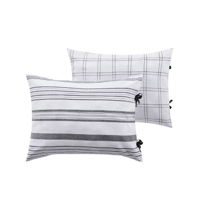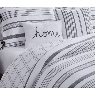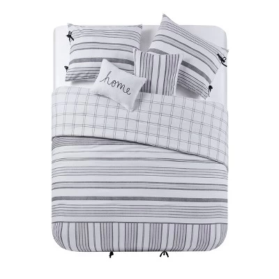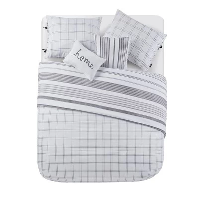 Give your bedroom décor a cozy, down-home feel with the Farmhouse Reversible Stripe Comforter Set. This reversible comforter features two sides of timeless prints in gray and white: stripes on one side and plaid on the other for versatile, mix-and-match look. Made of soft microfiber, this 4 or 5-piece comforter set includes a comforter, shams with tie accents (one sham in Twin set), and two decorative pillows to complete the look.
