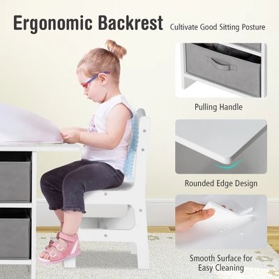 This table and chair set is designed for kids who are over 3 years old. They can have meals, do artworks, read books and play games with friends on the wide tabletop. And it comes with puzzles for you to play with kids and enjoy endless fun together. Beneath it there are 2 storage compartments that are fitted with removable cloth drawers. Your little one can learn to organize their belongings and arrange the space in an orderly way. What’s more, the toddler chair made of MDF material and solid wood is sturdy enough to support users up to 44 lbs. Besides, the size is suitable for kids to have a comfortable sitting experience. And round corners will protect the children from accidental injuries. This kids furniture set is the perfect gift for kids.