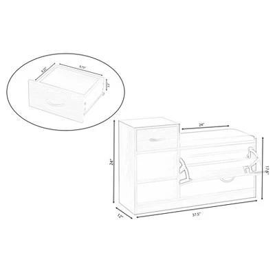 Organize your shoe collection with this shoe bench organizer. Designed with a hidden fold out rack, it provides storage for up to nine pairs of adult shoes. Additionally, the storage bench has 2 side open compartments and a drawer for extra storage. The shoe racks neatly fold closes, leaving only a sleek drawer exterior for display. Features various size compartments, useful for storing both shoes and boots. Its padded leather top serves as a comfy stool for when you need a seat. Welcome home.