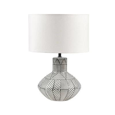 Make a statement with the modern style of the INK+IVY Agape Boho Ceramic Table Lamp. This round table lamp features a gourd-inspired base flaunts a geometric stripe pattern against the white finish to create a bold contrasting design. A round drum lamp shade acts as a soft light filter to create a warm ambiance, while also complementing the contemporary aesthetic. Perfect for illuminating your living room, this ceramic table lamp provides a sophisticated update to your home. Handle with care. Spot clean only.