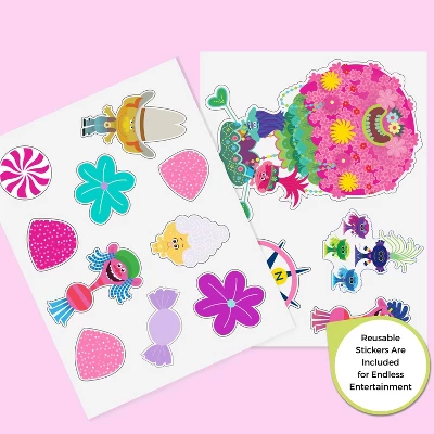 - REUSABLE STICKERS: The sides of the toy bin feature Trolls-inspired background scenes, while the included reusable stickers help children develop fine motor skills and promote creative play