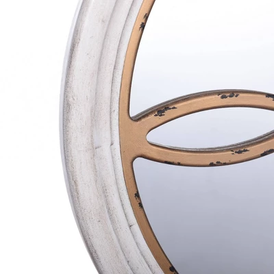 Boasting a unique design, the StyleCraft Round Wooden Traditional Wall Mirror in Distressed Gold and White is a great option for your master bedroom or bathroom. The white wash frame, rough distressed finish, and gold metal accent design work together to create a rustic style. This wall mirror is made from metal, MDF, and glass.