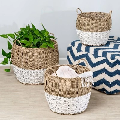 Keep your space, whichever space it is, tidy with these three different-size storage baskets that can hold anything from throw blankets to towels to books. These nesting storage baskets are stackable when not in use for easy storage, and handles make transporting items from room to room simple. In addition to their undisputed functionality, the two-colored seagrass design brings a unique design element to your surroundings.