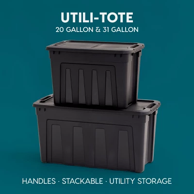 The Store-It-All totes is great for keeping your dorm, closet, or garage organized. The lid is designed for a bungee cord or strap to keep the tote secure while in a vehicle trunk or on a shelf. See other items in this series to create a modular storage system: this bin can be stacked with the 3-gallon, 5 gallon and 19-gallon Store-It-All Totes. Made in USA.
