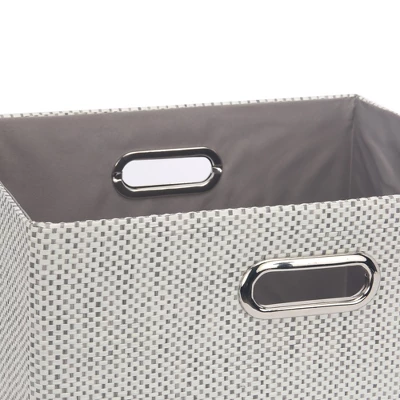 This sturdy storage basket is the perfect addition to your child’s nursery or playroom. It is made of gray and white cross weaved straws and has a trendy gray polyester lining inside. There are two silver handles on the sides for carrying. It easily folds up for compact storage when not being used. It is sized at approximately 12 1/2” X 11” X 9”. Spot clean only
