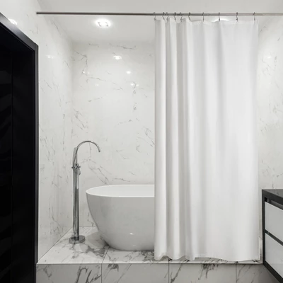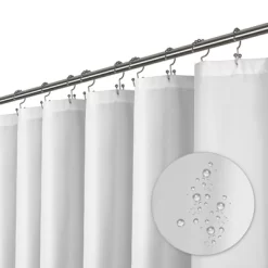 Made from expertly chosen and rigorously tested polyester fabric. The highly smooth yet textured design is shrinking, creasing, and has a protective PE coating for added water resistance properties to help prevent water bead formation so water swiftly rolls off the surface, keeping your bathroom dry and clean. The curtain’s simple yet classic creamy white color is sure to complement any bathroom decor. The Liba shower curtain fits any standard-size shower or tub, whether you have a straight or curved shower rod! Three heavy-duty magnets on the bottom keep the curtain in place- and away from your body. Features 6 rust-proof metal grommets and a reinforced header that prevents tearing and ensures long-term functionality.