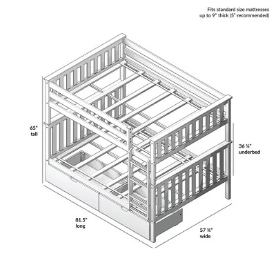 Plenty of room for sleep and play? Now that’s a win-win! The Max & Lily Full Over Full Bunk Bed with Storage Drawers is the perfect combination of functional and fun that both kids and parents love. Top bunk features tall 14” guardrails, so the bed safely fits standard mattress sizes. Storage drawers make organizing a breeze. Angled ladder with rounded edges offers comfortable, easy climbing. Added bonus – ladder is both reversible and removable, so it is flexible to work with any space. Solid, knot-free New Zealand pine wood adds strength and stability. All Max & Lily products use a durable, low VOC finish. The slatted head and footboards and flush, color-matched hardware give this bunk bed a clean, modern look. Instructions, upper/lower slat rolls, and required hardware are included. With solid plywood slats and a metal support bar for the top bunk, each sleeping surface can support 400 pounds of resting weight. This bed meets or exceeds Federal safety standards for kids furniture. When it’s time for play, this bunk bed’s space saving design frees up plenty of floor space by stacking two sleeping surfaces. 2+ adults make assembly simple and easy. The Full Over Full Bunk Bed with Storage Drawers from Max & Lily offers exceptional quality and affordability that kids and their parents will enjoy for years to come. Max & Lily is a member of the Maxwood family of brands – the kids furniture experts bringing a tradition of superior quality, safety and fun!