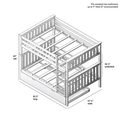 - Total Footprint: Full over full bunk bed measures 81.5” L x 57.75” W x 65” H