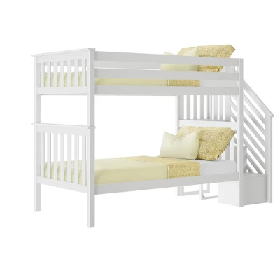 Plenty of room for sleep and play? Now that’s a win-win! The Max & Lily Twin Over Twin Bunk Bed with Staircase is the perfect combination of functional and fun that both kids and parents love. Top bunk features tall 14” guardrails, so the bed safely fits standard mattress sizes. Staircase with rounded edges offers comfortable, easy climbing. Added bonus – staircase is both reversible and removable, so it is flexible to work with any space. Solid, knot-free New Zealand pine wood adds strength and stability. All Max & Lily products use a durable, VOC finish. The slatted head and footboards and flush, color-matched hardware give this bunk bed a clean, modern look. Instructions, upper/lower slat rolls, and required hardware are included. With solid plywood slats and a metal support bar for the top bunk, each sleeping surface can support 400 pounds of resting weight. This bed meets or exceeds Federal safety standards for kids furniture. When it’s time for play, this bunk bed’s space saving design frees up plenty of floor space by stacking two sleeping surfaces. Add storage drawers or trundle to make this bed even more functional. 2+ adults make assembly simple and easy. The Twin Over Twin Bunk Bed with Staircase from Max & Lily offers exceptional quality and affordability that kids and their parents will enjoy for years to come. Max & Lily is a member of the Maxwood family of brands – the kids furniture experts bringing a tradition of superior quality, safety and fun!