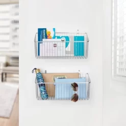 - Includes two wide shelf baskets, two large hooks that hang outside the shower and two smaller hooks