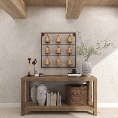 Our eclectic style inspired design metal bell wall plaque will make a great addition to your eclectic home when displayed on the walls of your living room. This item ships in 1 carton. Iron wall decor makes a great gift for any occasion. Can be hung vertically using the keyholes on the back; nails and screws not included. Suitable for indoor use only. This item ships fully assembled in one piece. Made in India. This is a single brass colored wall sculptures. Eclectic style.