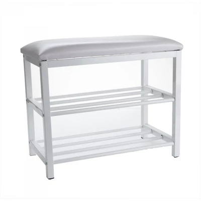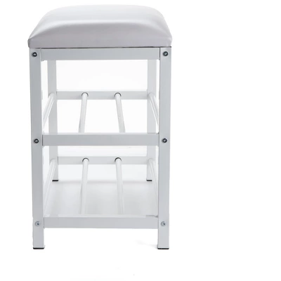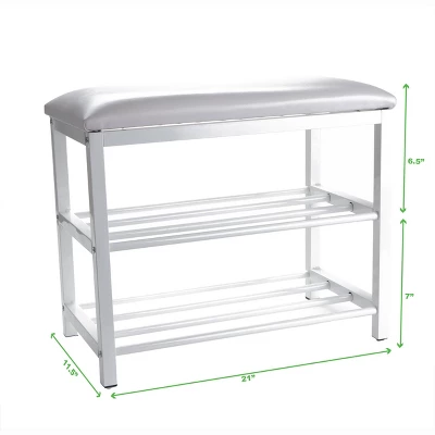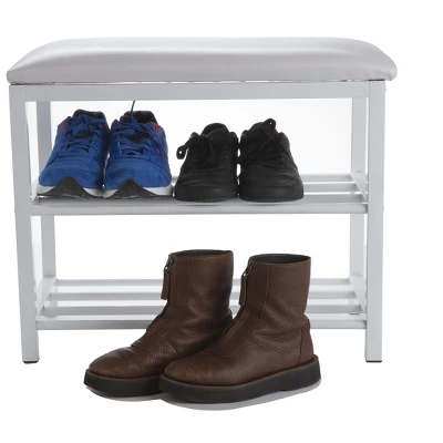 The Mind Reader Shoe Bench is sure to catch eyes of your guest the moment they walk into your home. What better way to greet someone than with a luxurious shoe bench that they can sit down on and take their shoes off while sitting. A modern and contemporary touch to any home decor and/or furniture. Created with attention to detail, the Mind Reader Shoe Bench is made of strong metal and aluminum pipes for storing your shoes, heels, and flats securely. The shoe bench storage shelf is sure to last for years of usage. Seat cushion will stay firm and comfortable for a long time. Ideal as a shoe storage rack for your entryway but can also be used as a step stool for your walk-in closet or hard to reach cabinets in the kitchen. Whether you like to use the bench as decor, or as a shoe bench in your living room, you will be totally satisfied with the multi-function all-purpose Mind Reader Bench Shelf. 2 metal shelves accommodates 3-5 pairs of shoes each shelf (depending on size) and give you a neat entry. The top tier has a cushion for sitting and is perfect for your workbag, handbag, purses or coat drop off at the end of a long day. Great for sitting while you wait as well. The dimensions are 12.5 L x 24 W x 20 H and it is made out of metal. The unit requires assembly, and all the hardware is included.