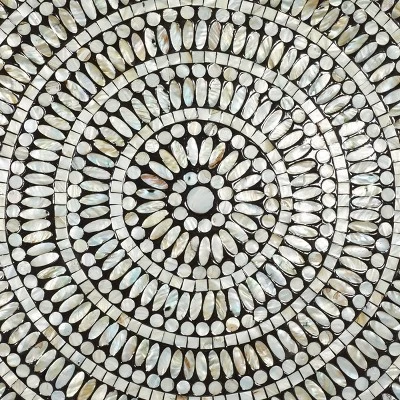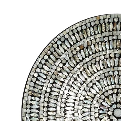 - It features a circular design with circular patterns from attached mother of pearl mussel shell materials