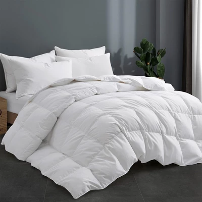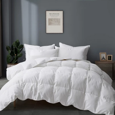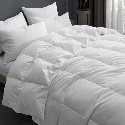 Enjoy a restful night sleep with with this premium white goose feather fiber and down comforter. It is filled with natural 5% white goose down and 95% white goose feather fiber to provide you a quality sleeping throughout the night. And this comforter is covered with a soft and down-proof cover, with a box stitch construction to keep the fill from shifting or clumping. Exquisite needle stitches and nice piping also add its durability.