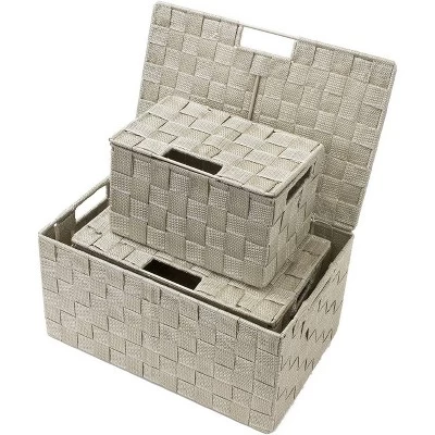 - 3-PIECE WOVEN BASKET BINS WITH LIDS (BEIGE) — Provides attractive, lightweight storage while keeping household items tidy and concealed — Set includes 3 stackable utility baskets of various sizes