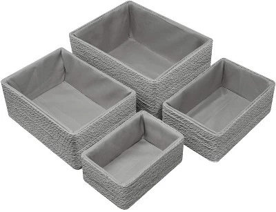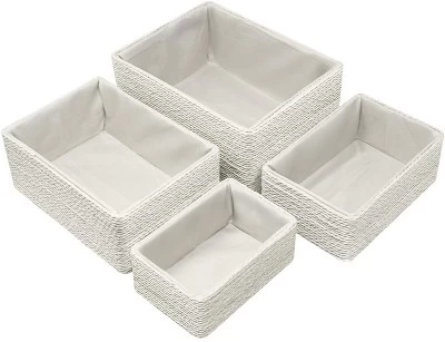 Organize household essentials with the Sorbus 4-Piece Basket Set! This set of four paper rope style bins come in various sizes to suite your storage needs. Store anything from makeup and accessories, to hand towels and office supplies When not in use, the smaller baskets stack inside the larger baskets to maximize space. It’s the perfect storage solution for any cube organizer, drawer, shelf, or tabletop to stay organized in style. Versatile for any space. These fabric storage bins have unlimited storage potential in your home. Tuck away toiletries and washcloths in the bathroom. Organize accessories in the closet, toys, or desk supplies in your office/workstation. This storage set is also suitable for rooms with limited space, especially apartments or college dormitories. The neutral/minimal style fits well with most decor for seamless organization in any space. Stackable design. Rectangular shape with woven style design. Made of paper rope material + cardboard. Spot clean. Approximate measurements: X-Large: 11 inch L x 8.25 inch W x 5 inch H ; Large: 9.75 inch L x 7 inch W x 4 inch H ; Medium: 8.75 inch L x 6 inch W x 3.12 inch H ; Small: 7.12 inch L x 4.75 inch W x 3 inch H.