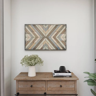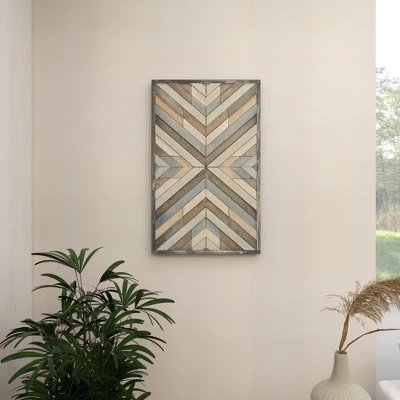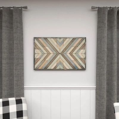 - •This multicolor rectangular wooden wall plaque features a distressed finish and a crisscross chevron pattern